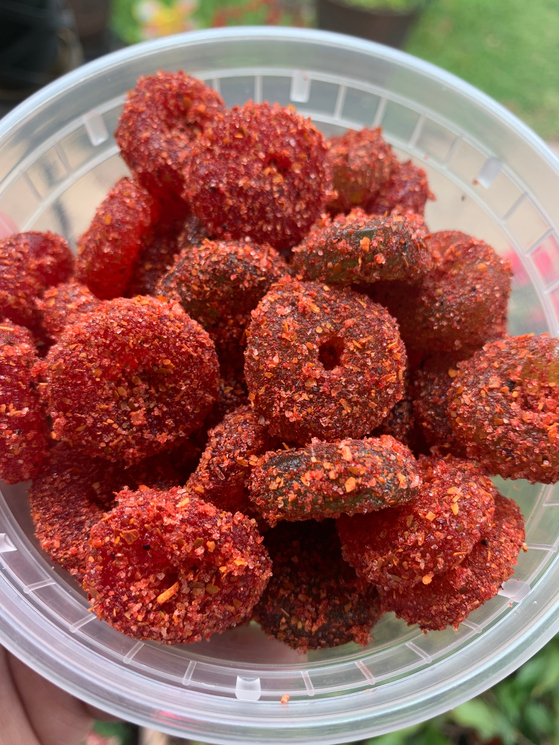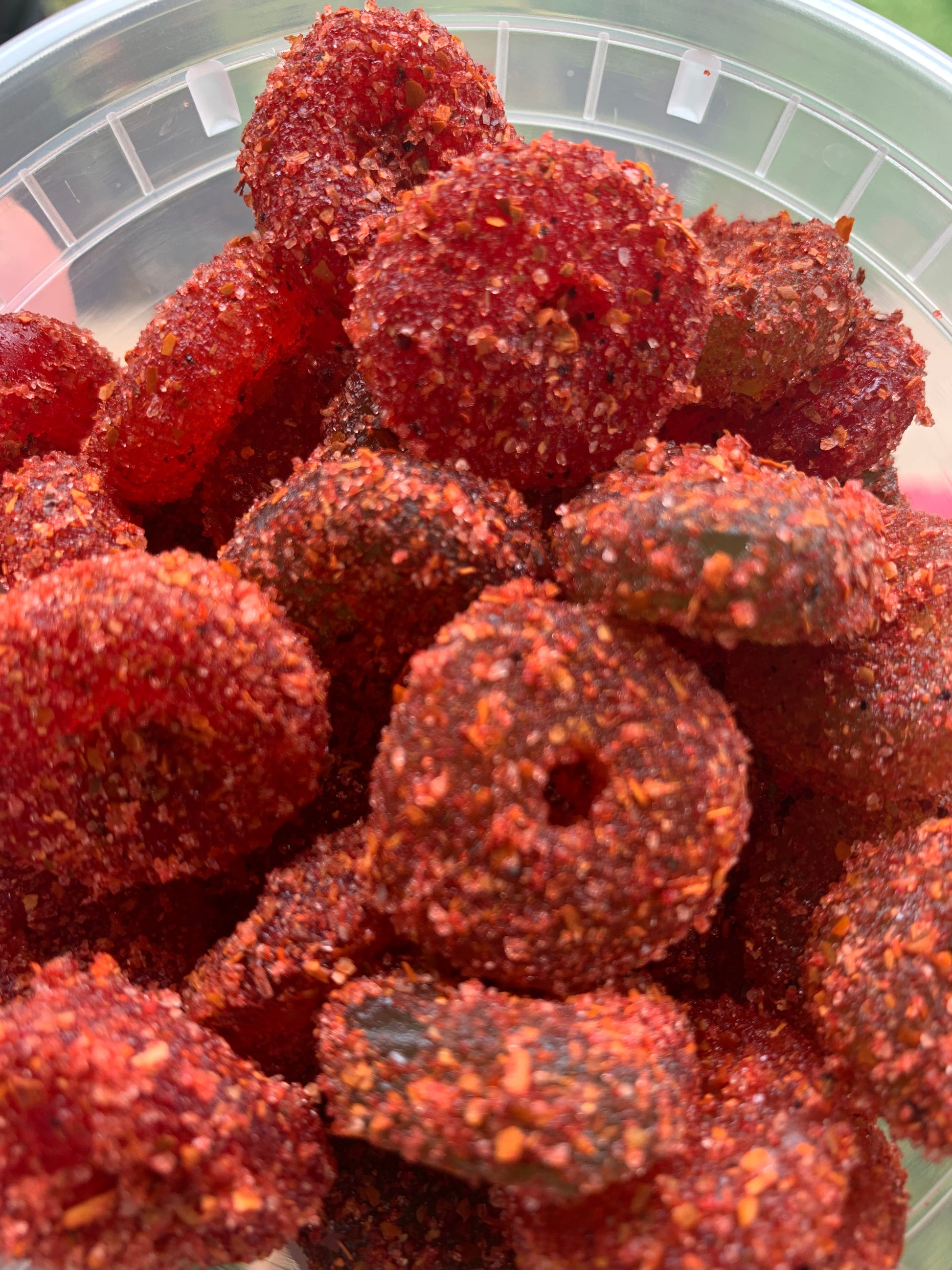 "Enhance your pool party or beach day with our Floaters (Life Savers) covered in tangy chamoy and tajin. These tasty snacks will not only satisfy your cravings, but also provide a refreshing and unique flavor. Perfect for summer gatherings!"