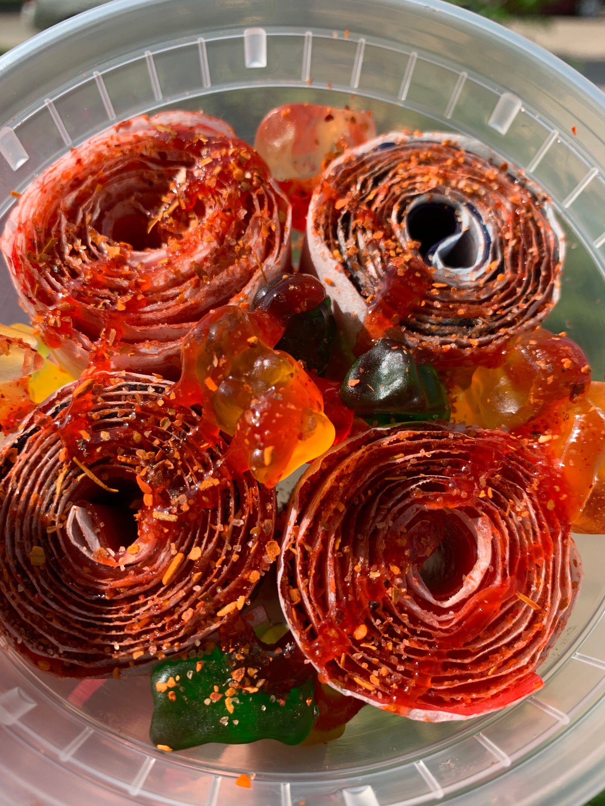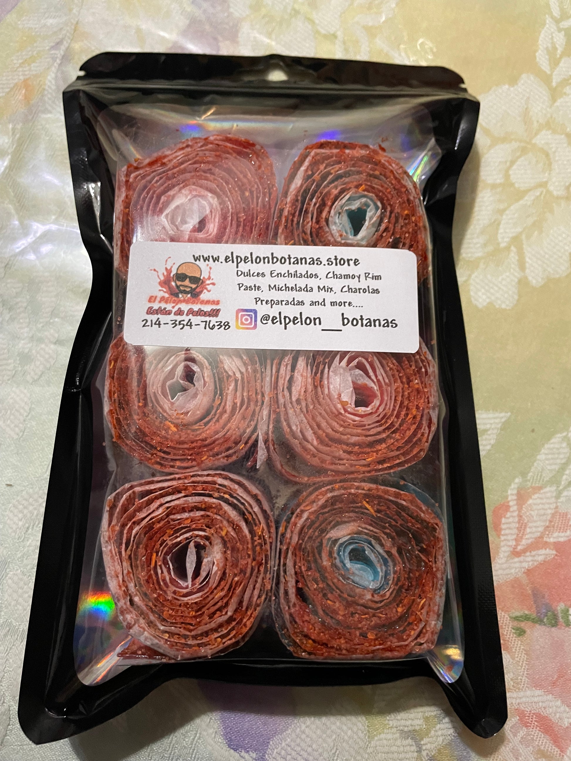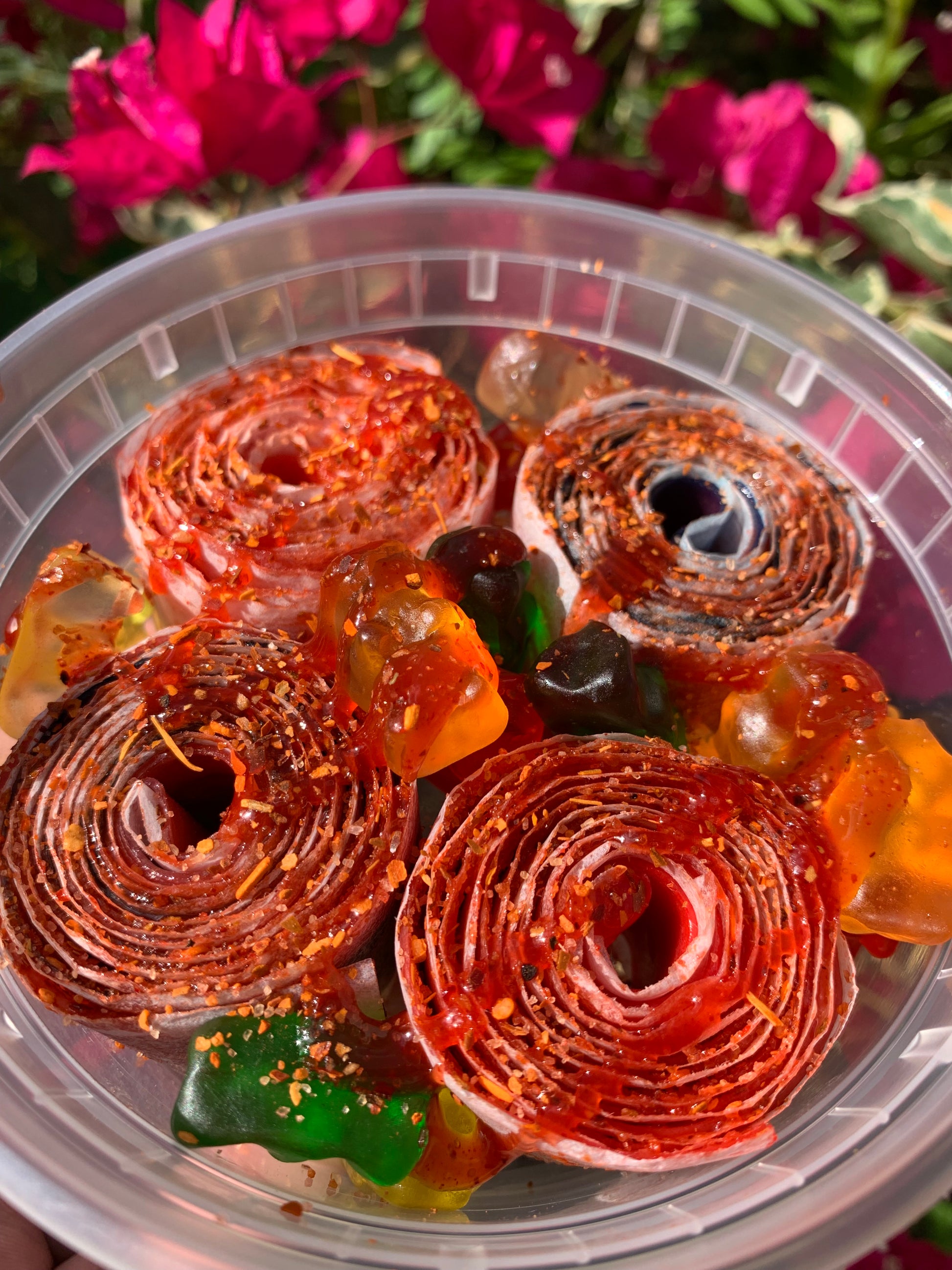 "Experience a burst of flavor with Rollos (Fruit by the Foot) covered in the perfect blend of chamoy and tajin. Indulge in a deliciously tangy and spicy snack that will keep you coming back for more. Perfect for satisfying cravings and adding some excitement to your day."